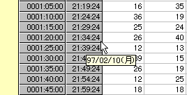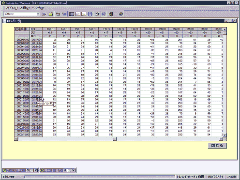 時系列に従って、計測データ全体または指定範囲を一覧表形式で表示します。