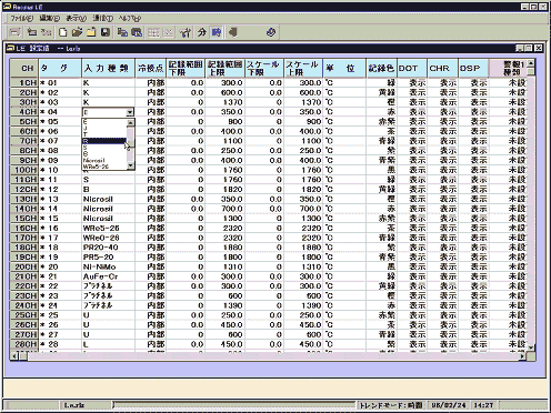 タグ、入力種類、冷接点有無、レンジ範囲、スケール範囲